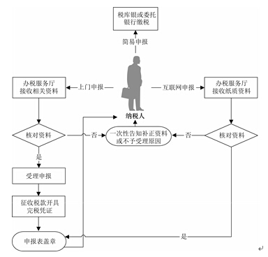 (1)办税服务厅接收纳税人申报资料或纳税人通过互联网络申报后提交的纸质资料,核对纳税人报送资料是否齐全、是否符合法定形式、填写内容是否完整、是否为未达起征点个体户,符合的即时办结;不符合的当场一次性告知纳税人应补正资料或不予受理原因。