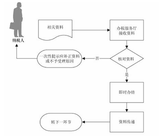 (1)办税服务厅接收资料,核对资料是否齐全、是否符合法定形式、填写内容是否完整,符合的即时办结;不符合的当场一次性提示应补正资料或不予受理原因。