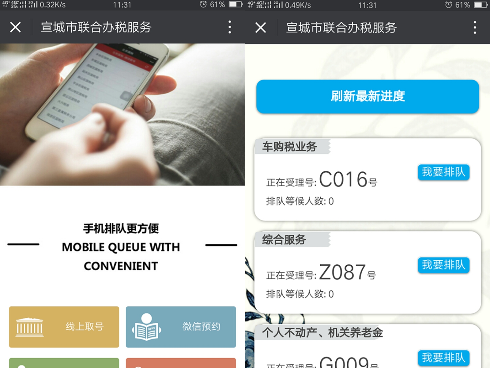 原来,不久前,宣城市国税地税联合办税服务中心将预约取号功能搬到了“掌上”,只要工作时间,就可以通过宣城国税或宣城地税微信公众号直接手机预约取号,并能实时查询等待人数,方便纳税人合理安排办税时间。
